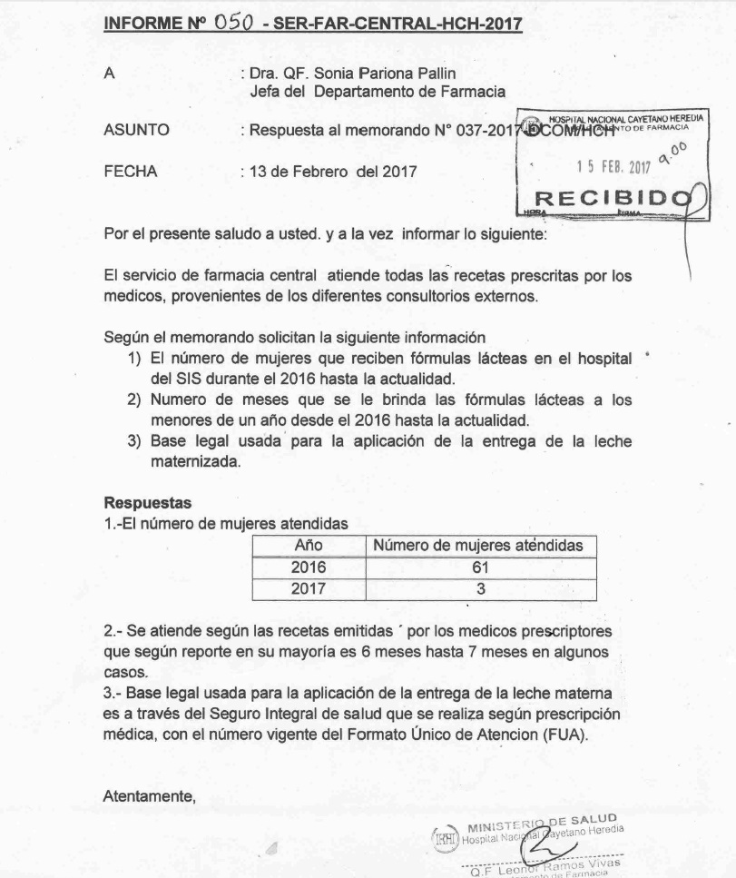 Descarga aquí la respuesta sobre la entrega de leche para niños de padres con VIH en hospital Cayetano Heredia
