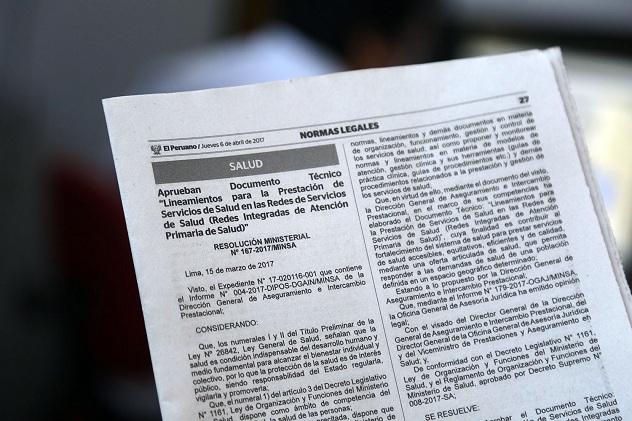 Lima, Perú.- El Ministerio de Salud (Minsa) aprobó el Documento Técnico: “Lineamientos para la Prestación de Servicios de Salud en las Redes de Servicios de Salud (Redes Integradas de Atención Primaria de Salud)”, según Resolución Ministerial N° 167-2017/MINSA, publicado hoy en el Diario Oficial El Peruano.