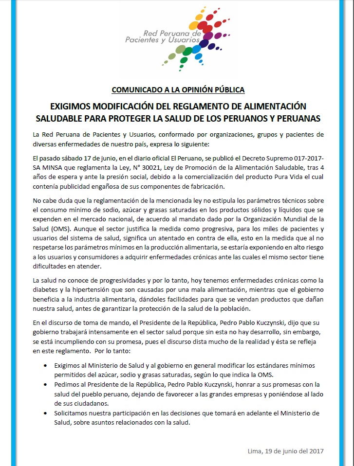 El documento difundido a la opinión público, llama la atención al presidente Pedro Pablo Kuczynski, porque según específica la Red de Pacientes, mediante esta norma que reglamenta la Ley N°30021, Ley de Promoción de Alimentación Saludable, solo se favorece a las grandes empresas y no a la ciudadanía.