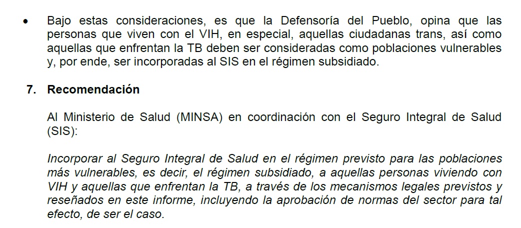 El informe defensorial culmina con la recomendación de «incorporar al Seguro Integral de Salud en el régimen previsto para las poblaciones más vulnerables, es decir, el régimen subsidiado, a aquellas personas viviendo con VIH y aquellas que enfrentan la TB, a través de los mecanismos legales previstos y reseñados en este informe, incluyendo la aprobación de normas del sector para tal efecto, de ser el caso».