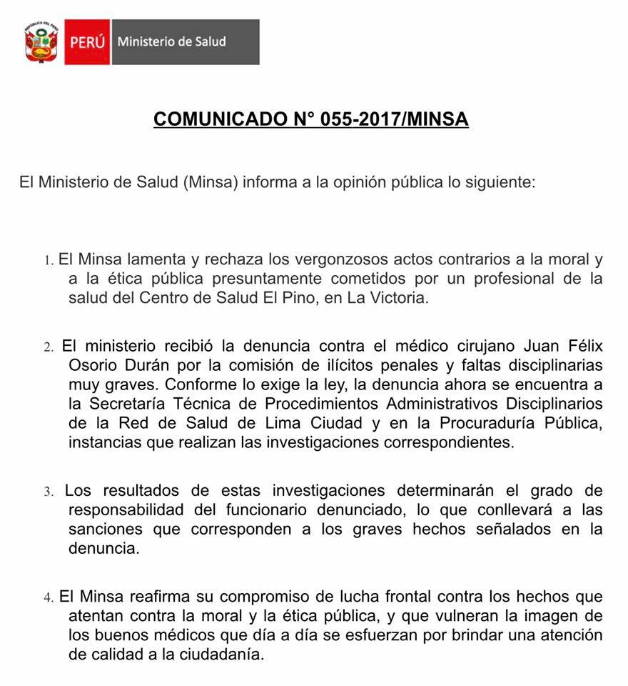 «El ministerio recibió la denuncia contra el médico cirujano Juan Félix Osorio Durán por la comisión de ilícitos penales y faltas disciplinarias muy graves. Conforme lo exige la ley, la denuncia ahora se encuentra a la Secretaría Técnica de Procedimientos Administrativos Disciplinarios de la Red de Salud de Lima Ciudad y en la Procuraduría Pública, instancias que realizan las investigaciones correspondientes», indica el comunicado.