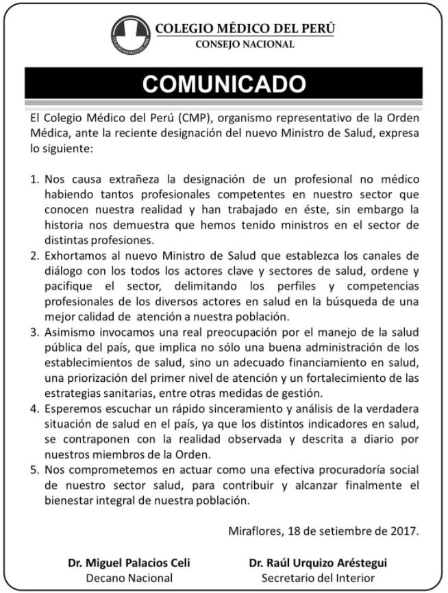 El Colegio Médico del Perú, también emitió un comunicado mostrando su disconformidad por su designación.