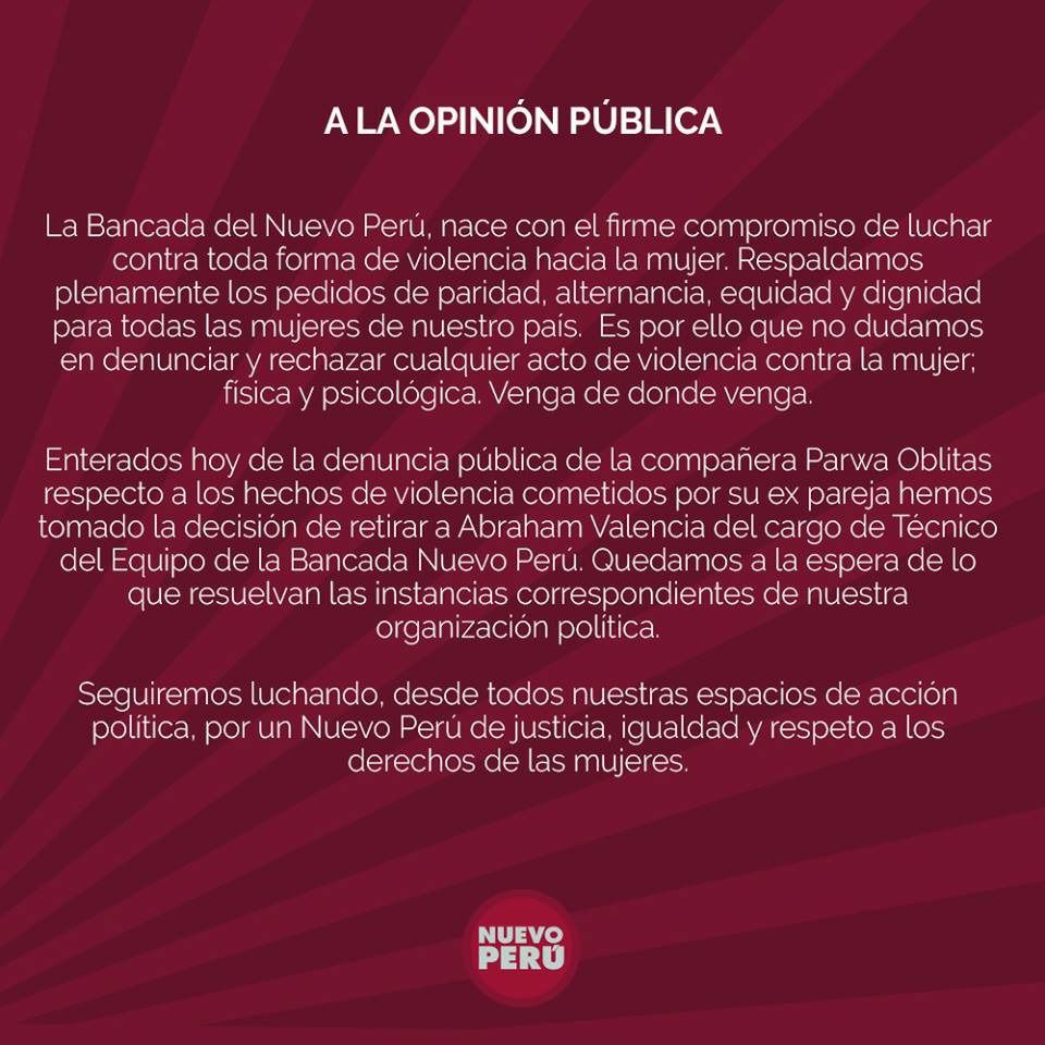 Por medio de un comunicado el grupo parlamentario Nuevo Perú manifestó la separación de Valencia al cargo de asesor técnico de dicha bancada.