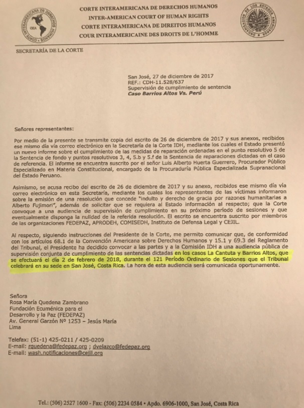 La audiencia se realizará el 2 de febrero en Costa Rica, sede de la corte, a la que deberán acudir abogados de las víctimas de ambas matanzas y representantes del Estado Peruano para informar sobre el indulto otorgado a Fujimori en 13 días.