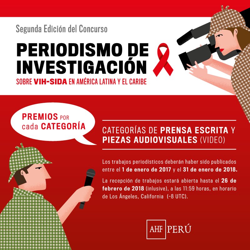 Lima, Perú.- Con el propósito de promover un periodismo responsable, comprometido y sensible hacia los temas de VIH y Sida, la fundación internacional AIDS Healthcare Foundation (AHF) realiza por segundo año consecutivo la Segunda Edición del Concurso “Periodismo de Investigación sobre VIH/Sida en América Latina y el Caribe”.