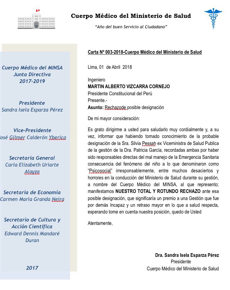 Sin embargo, el Cuerpo Médico del Ministerio de Salud, presidida por Sandra Esparza Pérez publicaron una carta que será enviada al presidente Martín Vizcarra en «rechazo rotundo» a la designación de Pessah, ya que aseguran que significa «un premio a una gestión que fue por demás incapaz».