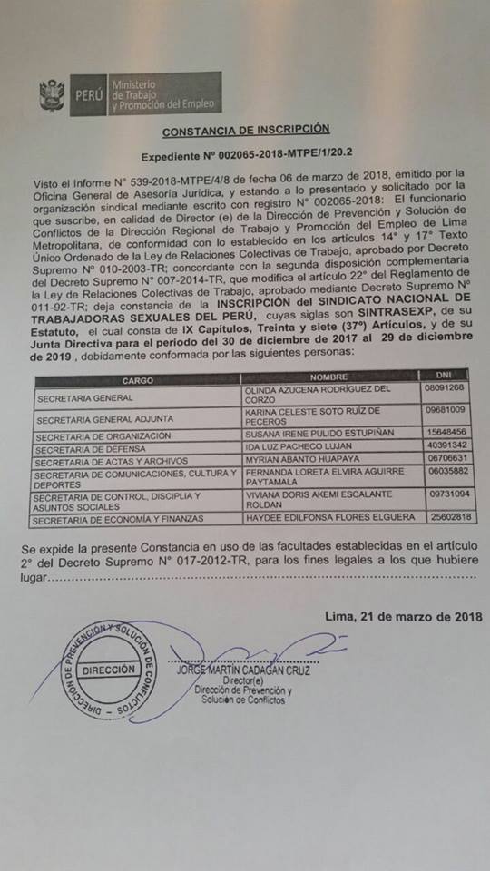Lima, Perú.- Luego de dos años de ardua tarea las Trabajadoras Sexuales del Perú lograron el reconocimiento de su trabajo y su sindicalización de parte del Ministerio de Trabajo y Promoción del Empleo.