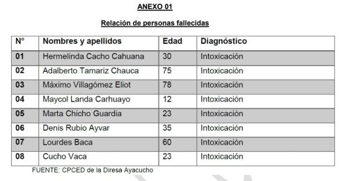 Dirección Regional de Salud (Diresa) de Ayacucho dio a conocer la identidad de ocho de las diez víctimas fallecidas por intoxicación tras consumir, presuntamente, alimentos en mal estado. De estas personas, siete son adultos y un menor de edad.