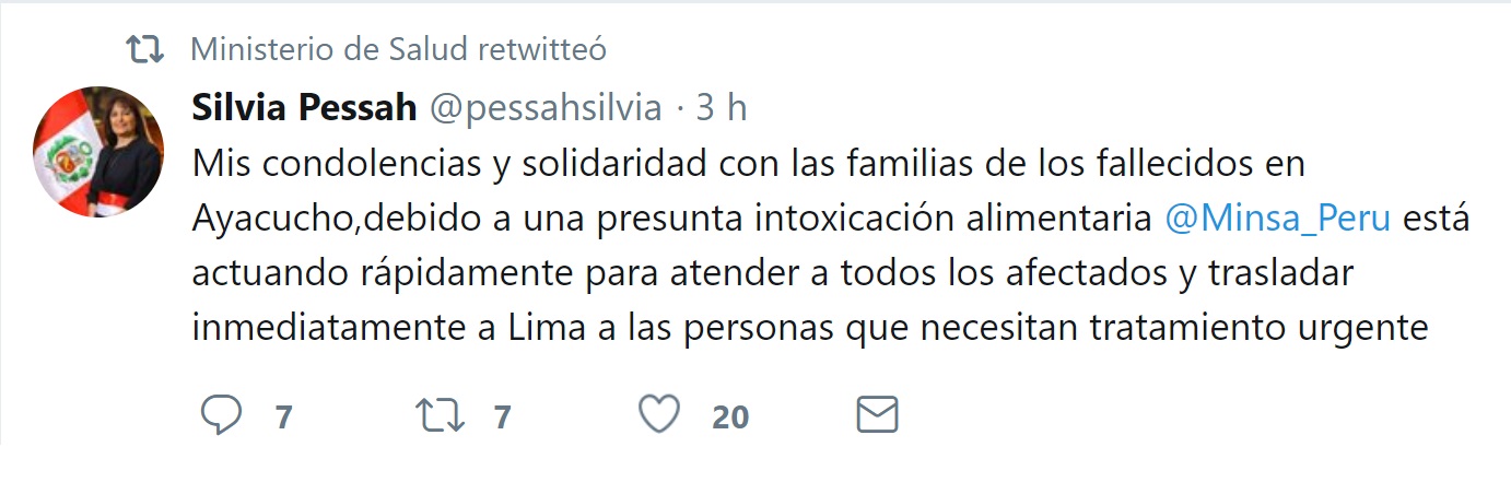 La titular del Minsa, Silvia Pessah, expresó su solidaridad con las familias de los nueve fallecidos por intoxicación masiva e informó que se trasladarán a Lima a las personas que requieran atención urgente, por medio de un puente aéreo.