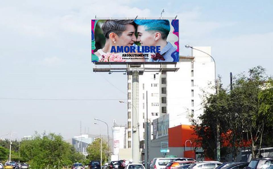 Lima, Perú.- La campaña #MásAmorMenosOdio, un mensaje que se encuentra en más de 20 paneles publicitarios ubicados en las principales avenidas de la capital, busca poner en agenda la unión civil y matrimonio igualitario de la comunidad Trans, Lesbianas, Gais, Bisexuales e Intersexuales – TLGBI.