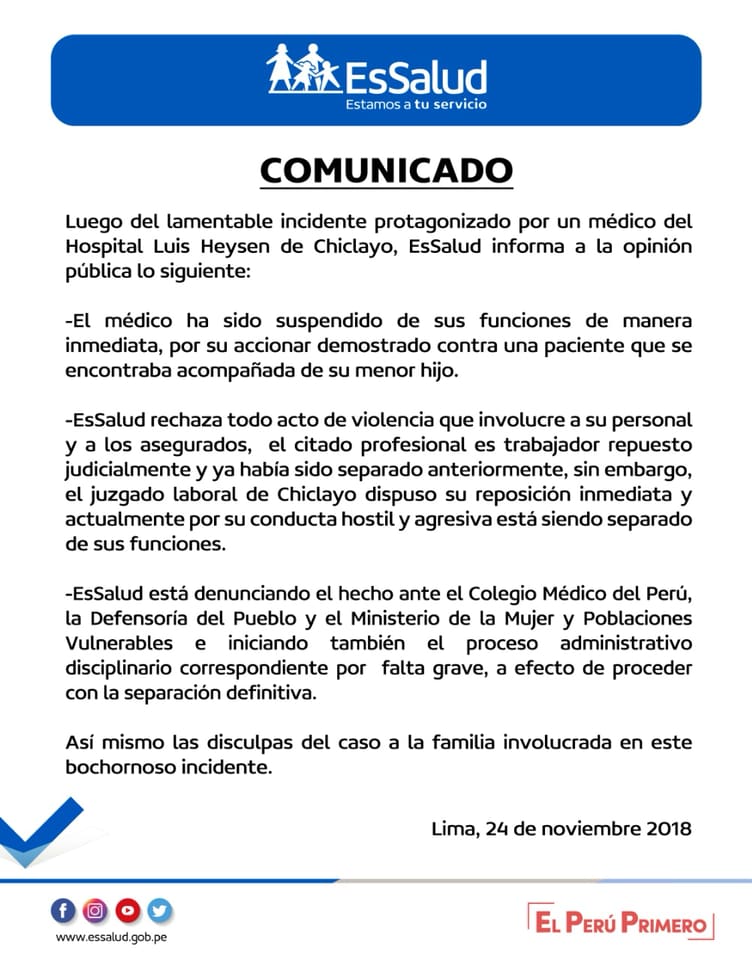 El gerente de la red asistencial de EsSalud Lambayeque, Juan Rodríguez Terrones, aseguró que el galeno ingresa y sale de EsSalud, pues desde hace más de 8 años tiene varios procesos por denuncias de maltrato, pero que hasta en dos oportunidades ha sido repuesto en el cargo por la vía judicial.