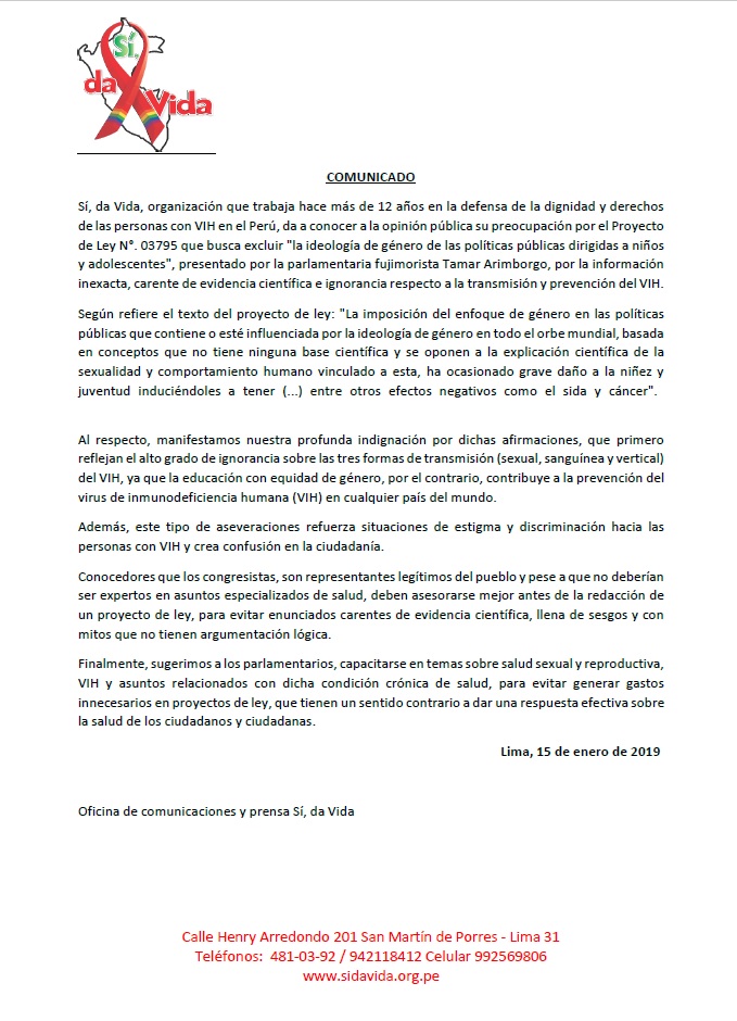 Lima, Perú.- La institución Sí, da Vida, organización que trabaja hace más de 12 años en la defensa de la dignidad y derechos de las personas con VIH en el Perú, cuestionó el  Proyecto de Ley N°. 03795 que busca excluir «la ideología de género de las políticas públicas dirigidas a niños y adolescentes», presentado por la parlamentaria fujimorista  Tamar Arimborgo y en el que refiere que la educación con enfoque de género puede causar cáncer y sida.