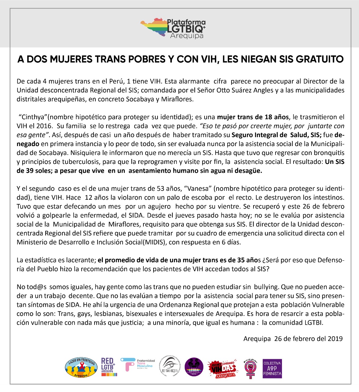 La plataforma LGTBIQ emite comunicado en el que expresan su indignación por dos casos de mujeres trans en pobreza extrema y con VIH, que no lograron calificar al SIS gratuito.
