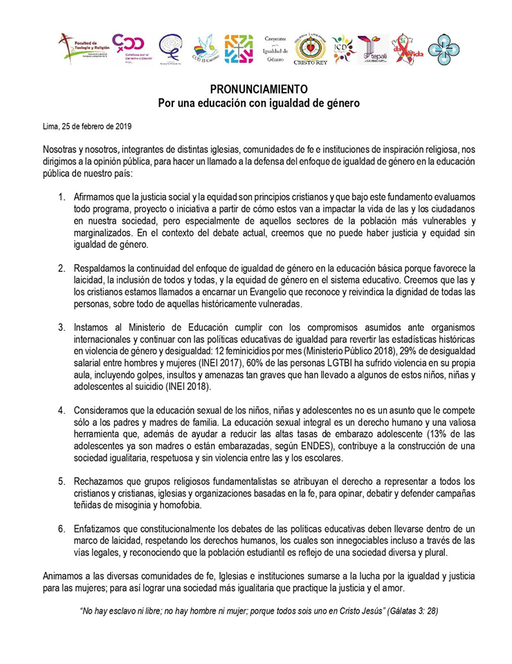 «Instamos al Ministerio de Educación cumplir con los compromisos asumidos ante organismos internacionales y continuar con las políticas educativas de igualdad para revertir las estadísticas históricas en violencia de género y desigualdad: 12 feminicidios por mes (Ministerio Público 2018), 29% de desigualdad salarial entre hombres y mujeres (INEI 2017), 60% de las personas LGTBI ha sufrido violencia en su propia aula, incluyendo golpes, insultos y amenazas tan graves que han llevado a algunos de estos niños, niñas y adolescentes al suicidio (INEI 2018)», se lee en el comunicado.
