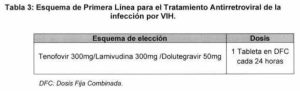 La nueva norma técnica estableció como esquema de primera línea antirretroviral la combinación de tenofovir (300 mg), lamivudina (300 mg) y dolutegravir (50 mg), comprimidas en una sola pastilla de consumo diario.