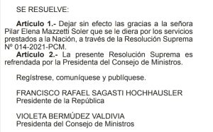 El Gobierno dispuso este martes dejar sin efecto las gracias a la exministra por los servicios prestados, concedidas mediante el Decreto Supremo 014-2021-PCM, expedido el último sábado, en el que se aceptaba su renuncia al cargo.