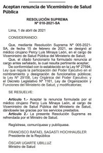 En el dispositivo se publicó la resolución en la cual se acepta la renuncia de Percy Luis Minaya León, al cargo de Viceministro de Salud Pública.