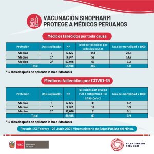 “La tasa de mortalidad de los médicos que completaron su esquema de vacunación con las dos dosis se redujo en 98 % (de 6.2 % en los no vacunados a 0.1 % en los vacunados con dos dosis), lo que confirma la buena protección que ofrece la vacuna de Sinopharm”, señaló el viceministro de Salud Pública, Gustavo Rosell.
