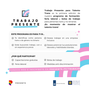 Lima – Perú.- Una luz de esperanza. Con el fin de alcanzar una plaza laboral y facilitar el acceso a un trabajo digno donde se respeten sus derechos, la ONG Presente, lanza Trabajo Presente, un programa gratuito, de empleabilidad y bolsa de trabajo para personas trans y no binarias.