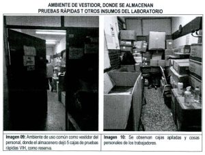Las 22 mil con 20 pruebas rápidas para VIH de cuarta generación se obtuvieron en noviembre del año pasado por un precio superior a los 92 mil soles. Sin embargo, la inspección de la Contraloría descubrió que las pruebas rápidas se guardan en un depósito bajo unas escaleras de concreto y no en un laboratorio. Las cajas con los productos se almacenan en contacto directo con el piso, desdeñando así el uso de parihuelas para evitar la contaminación del envase.