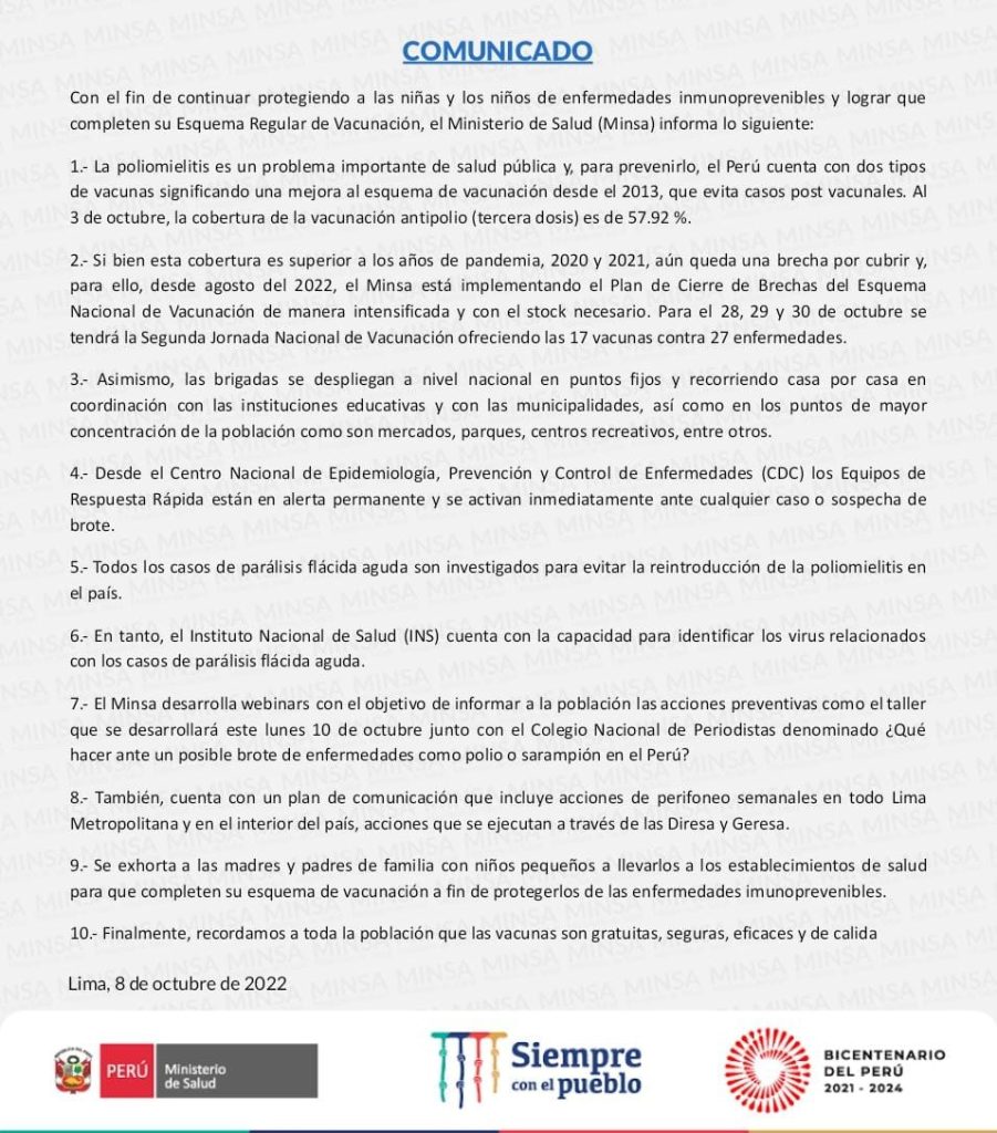 Luego de 33 años se reporta en Brasil un caso de poliomielitis, lo que ha generado alarmas en los países vecinos. El Ministerio de Salud (Minsa) ha emitido un comunicado y anuncia que busca cerrar las brechas en el proceso de vacunación que se ha mantenido en nivales bajos durante la pandemia del Covid -19.