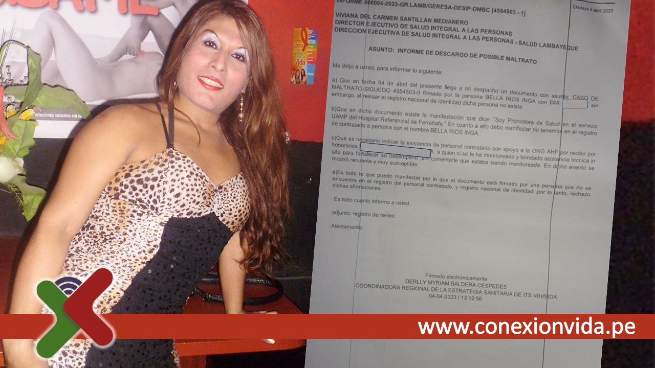 Chiclayo, Perú.- Bella Rios Inga, Promotora de Salud del Centro Referencial de ITS y VIH/ Sida de la ciudad de Chiclayo, nunca imaginó que tras denunciar a la coordinadora de la estrategia de VIH de la Dirección General de Salud de Chiclayo, Derlly Baldera Céspedes, su respuesta evidencie el maltrato que asegura haber recibido tras realizar servicios de brigadas para ubicar nuevos casos de VIH en zonas de trabajo sexual de la región.