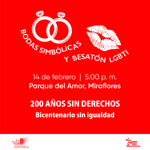 La actividad será este miércoles 14 de febrero desde las 5 de la tarde en el Parque del Amor, donde cotraerán nupcias simbólicas 7 parejas TLGB y otras más renovarán votos. La congresista Susel Paredes, que presentó el proyecto de ley sobre el matrimonio igualitario, participará de la actividad.