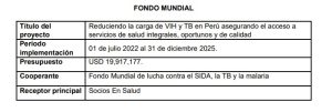 Es decir, que parte de los avances en la respuesta al VIH y la tuberculosis en el país, se la debemos al financiamiento del Fondo Mundial. Incluso para hacer memoria, debemos recordar que el presupuesto donado al Perú en el 2004 permitió que se inicie el tratamiento antirretroviral durante los primeros años del programa.