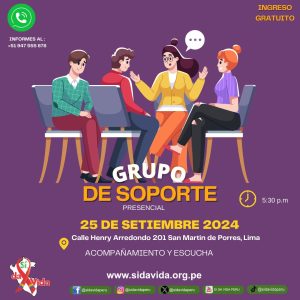 La jornada inicia a las 5:30 p.m., con el Grupo de Soporte para personas con condiciones crónicas de salud, el Coordinador del Grupo de Sí, da Vida, es Juan Carlos Cárdenas Mendoza. El objetivo, es lograr la socialización de las PVVS (personas viviendo con VIH), así como también de las personas afectas y allegados logrando un ambiente íntimo, donde podrás conversar con toda confianza sobre tus inquietudes y problemas.
